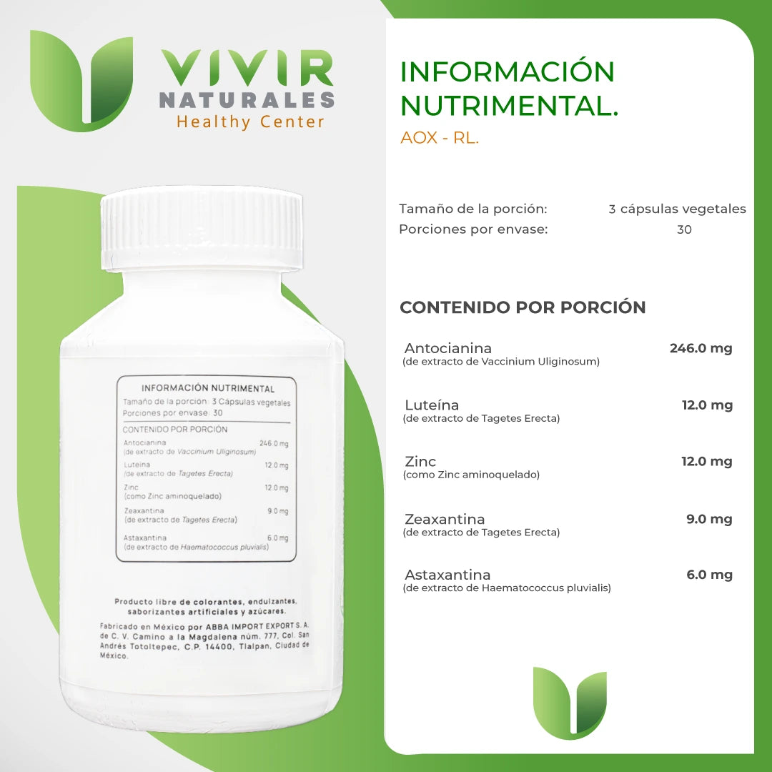 Producto combinado con antocianinas, astaxantinas luteína, zeaxantina y zinc, fue formulado con la finalidad para apoyar la salud y la función ocular. Proporciona un apoyo nutricional integral para la salud ocular y potentes antioxidantes para proteger las células de la oxidación y el daño de los radicales libres.