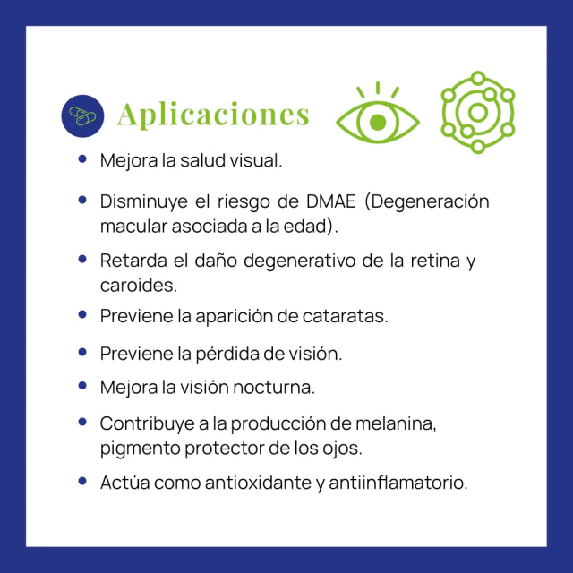 · Actúa como antioxidante y antiinflamatorio: se ha demostrado la efectividad de los antioxidantes en la salud visual. El estrés oxidativo es un factor implicado en el desarrollo de las principales patologías tales como cataratas, glaucoma y degeneración macular asociada a la edad (DMAE).